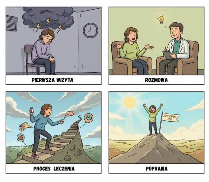 Jeśli rozważasz wizytę u psychiatry, prawdopodobnie w Twojej głowie kłębi się wiele pytań i obaw. To zrozumiałe – nie wiedząc, czego się spodziewać, łatwo o niepokój. Ten wpis powstał po to, by pokazać, jak naprawdę wygląda leczenie psychiatryczne – od pierwszego kontaktu aż po moment, w którym odzyskujesz równowagę. To nie jest droga, którą przechodzisz sam – to wspólny proces: Ty i lekarz po tej samej stronie.  Decyzja i pierwsze kroki Wiele osób zwleka z wizytą, bo odczuwa wstyd, lęk przed oceną lub po prostu nie wie, czego się spodziewać. Chcę to jasno powiedzieć: dbanie o zdrowie psychiczne jest tak samo zwyczajne i ważne jak dbanie o serce czy kręgosłup. Psychiatra nie ocenia – pomaga. Umówienie wizyty to prosty krok – wystarczy wypełnić formularz online. Już na tym etapie obowiązuje pełna poufność. Jeśli wolisz, możesz napisać kilka słów o swojej trudności, ale nie musisz. Wystarczy, że zrobisz ten pierwszy krok.